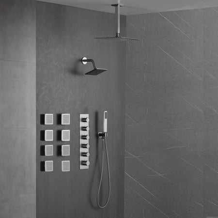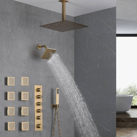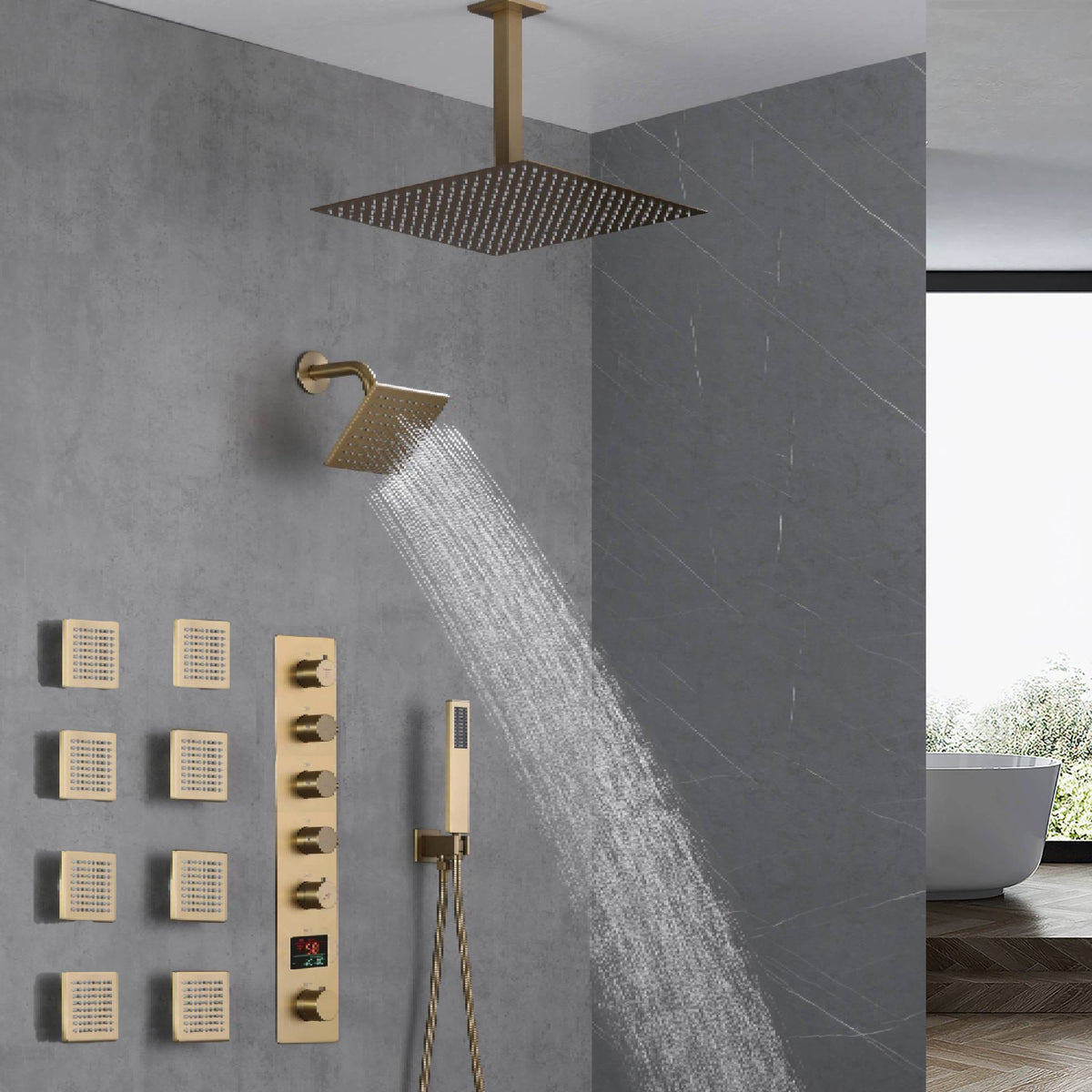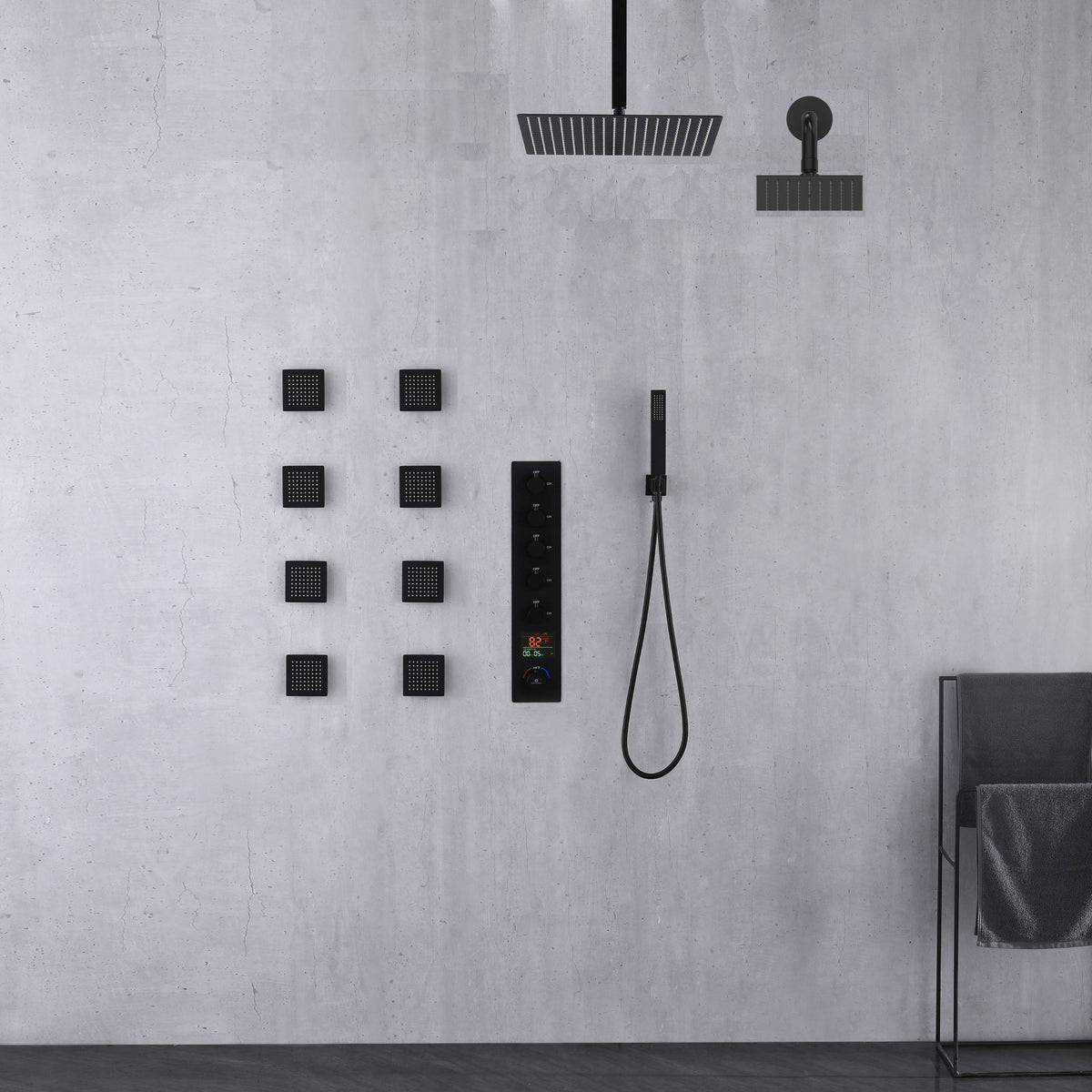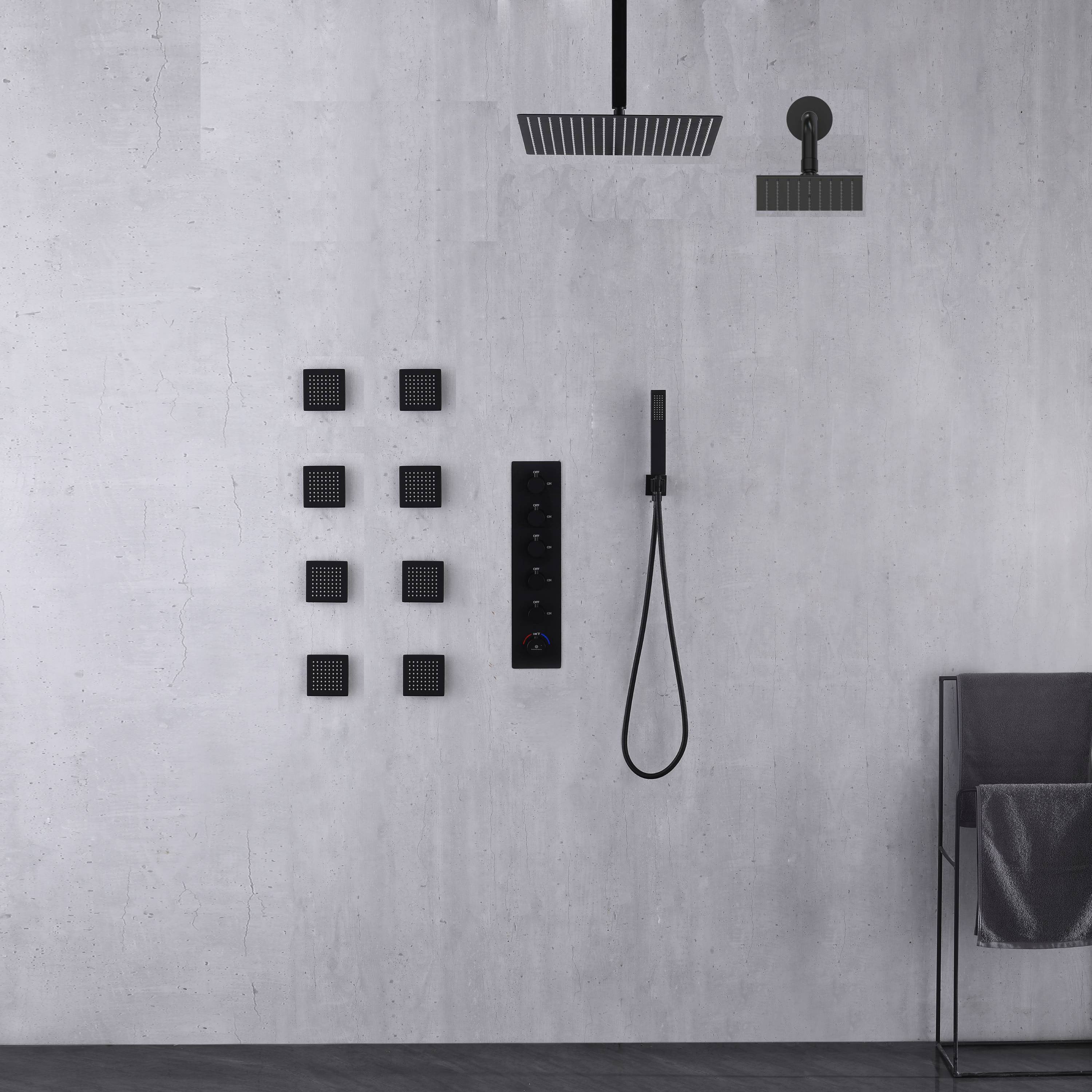 Matte Black Or Brushed nickel or Brushed Gold Rainfall Shower System: 12" or 16" with 5-Way Thermostatic Valve, Body Jets