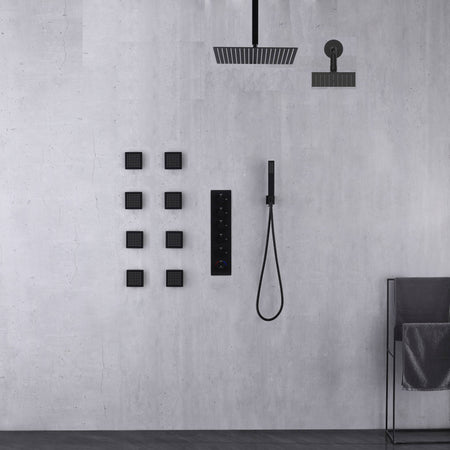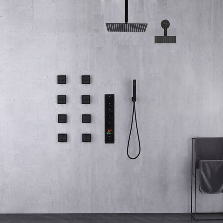 Indulge in Luxury: Elevate your shower experience with our Matte Black Rainfall Shower System, featuring a 5-way thermostatic rough-in valve, 8 body jets, and a regular head.