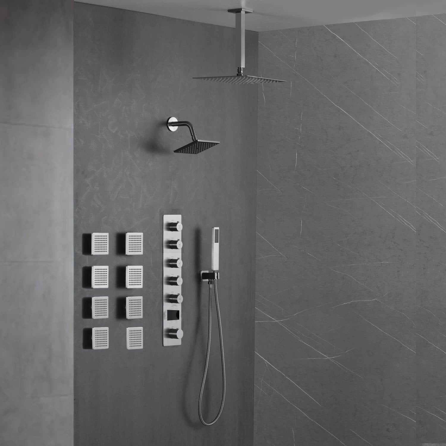 - Versatile Functionality: Enjoy a combination of rainfall, 8 body jets, one regular head and handheld shower options for a customized shower experience.
