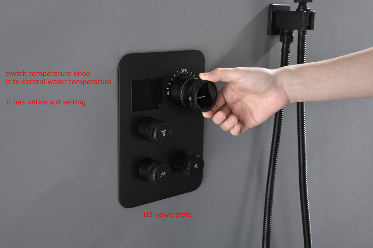 (3) U3 valve style: with 3 push buttons and push buttom to turn on or off the water and it can adjust the water flow and pressure via switching the button. it is with digital display that work by water flow and no need battery. each function work all together and separately, water flow is from 0 ~ 7.8GPM. it recommends 3/4 inch hot and cold water pipelines.