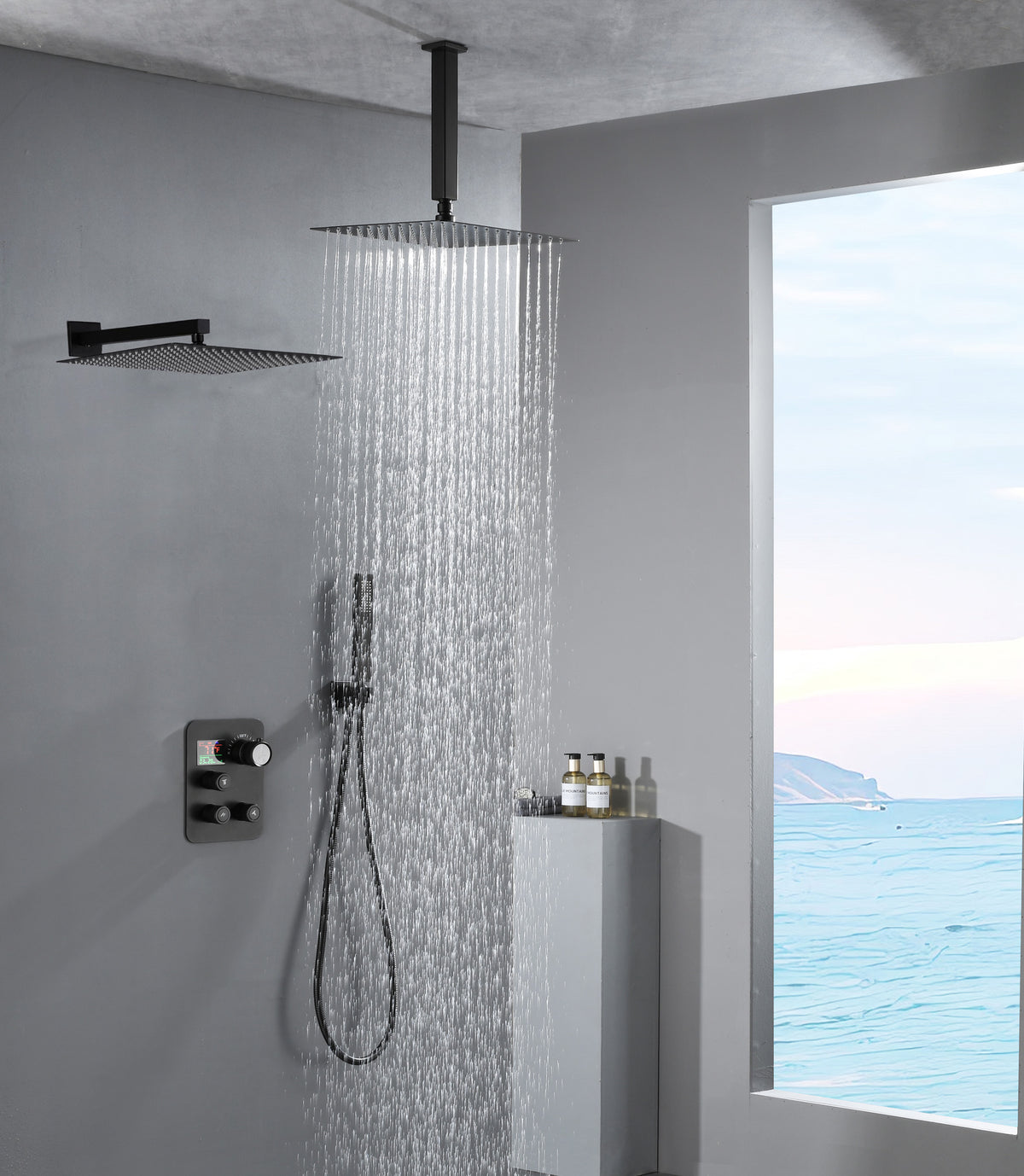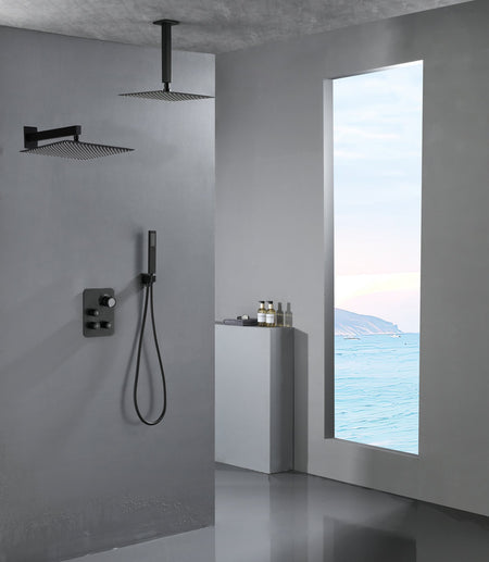 matte black wall mount rainfall shower head ceiling mount rainfall shower head 3 way thermostatic shower faucet each function work all together and separately