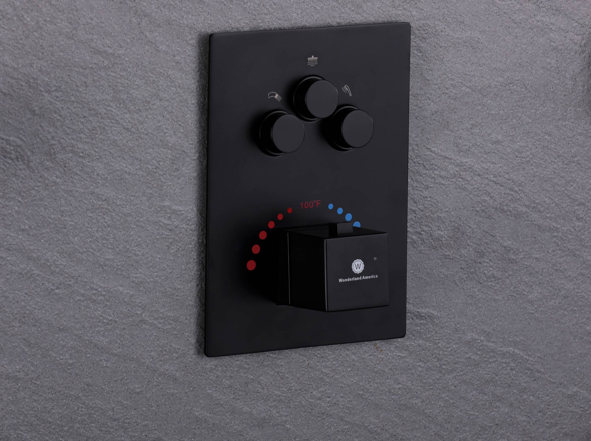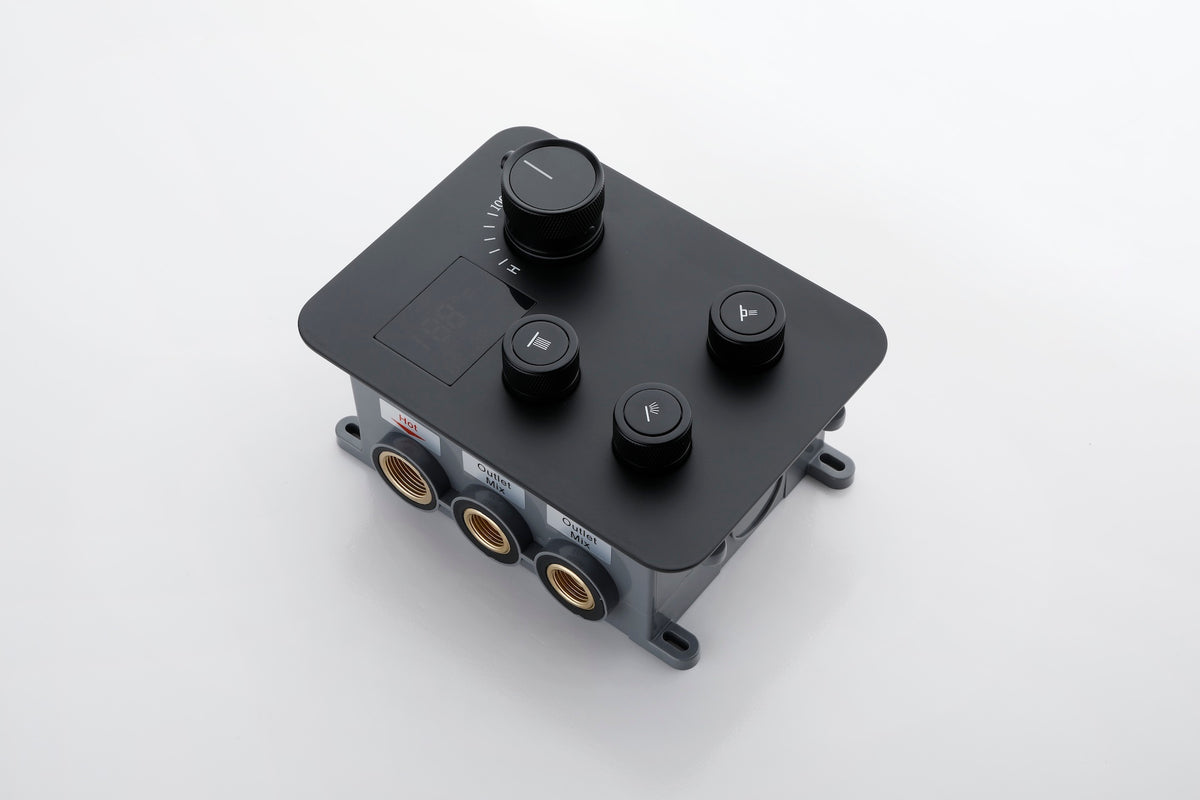 The shower mixer valve control, made from brass and ceramic valve and finished in matte black, provides thermostatic control over the shower functions. It allows for all functions to work together or separately, providing a tailored shower experience. It connects via NPT 1/2 inch standards.