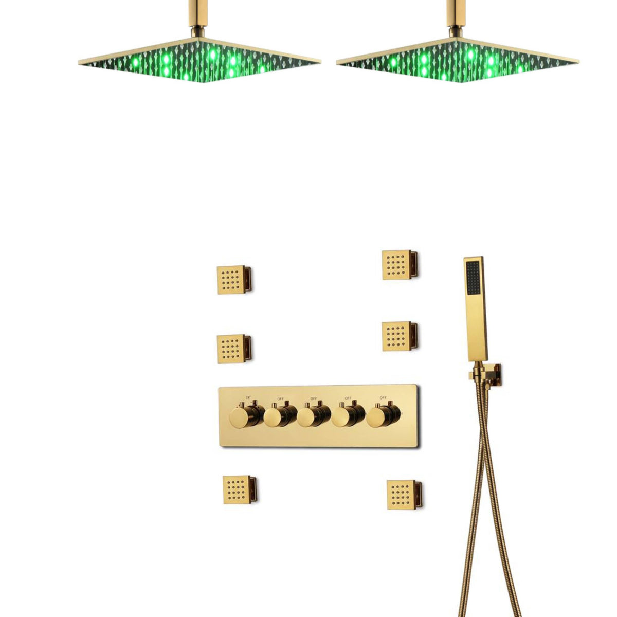 Polished Gold Dual rainfall shower heads 4 Way Thermostatic Shower Faucet with 2 Inch Body Jet