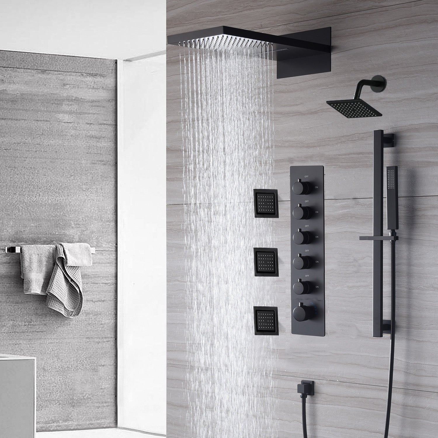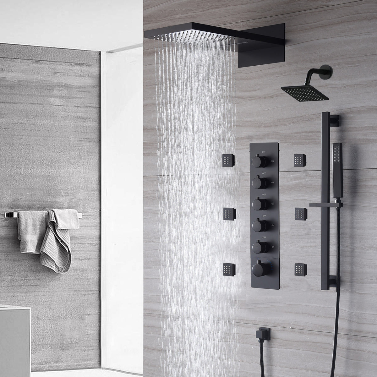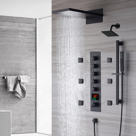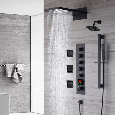 The Exquisite 22'' Matte Black 5-Way Thermostatic Shower Faucet with Waterfall, Rain Massage, Body Jet Spray, regular head and Sliding Bar