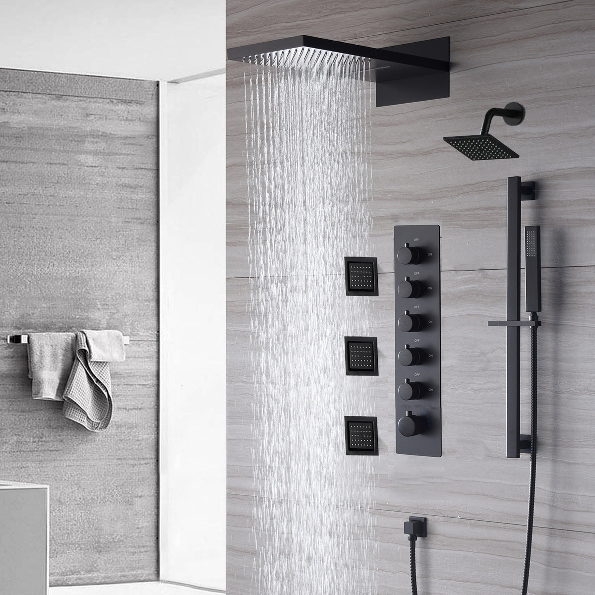 - 5-Way Brass Thermostatic Valve: Each function (rainfall, waterfall, body jets massage, and handheld shower) can be operated separately or simultaneously, providing versatility and customization options.