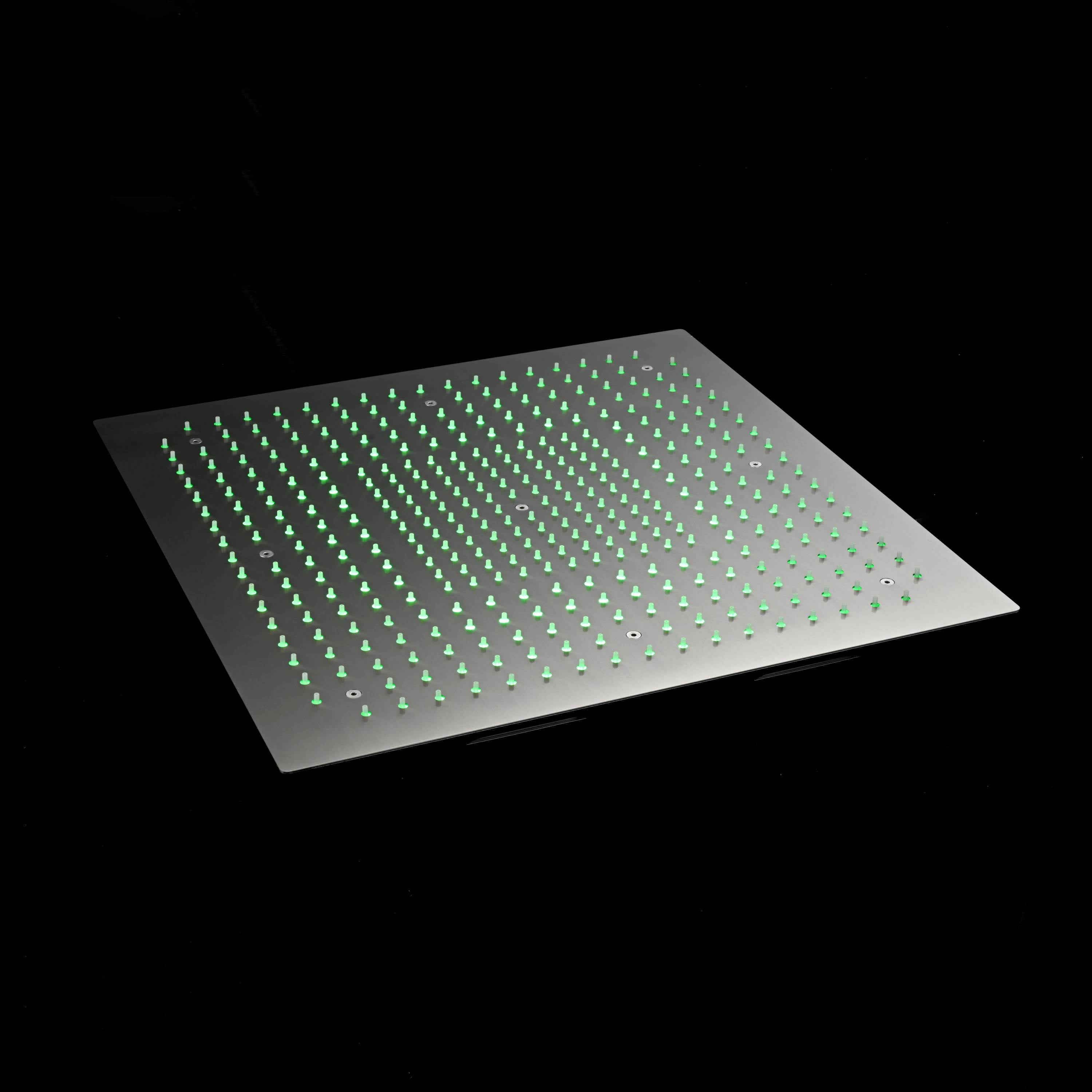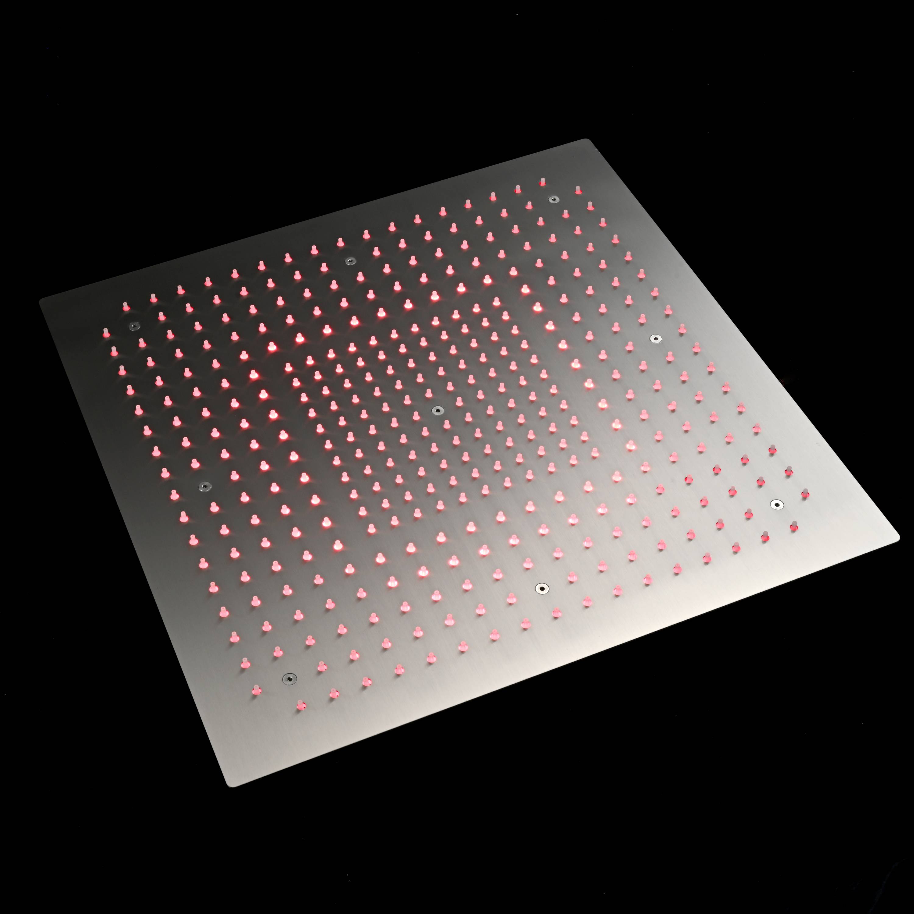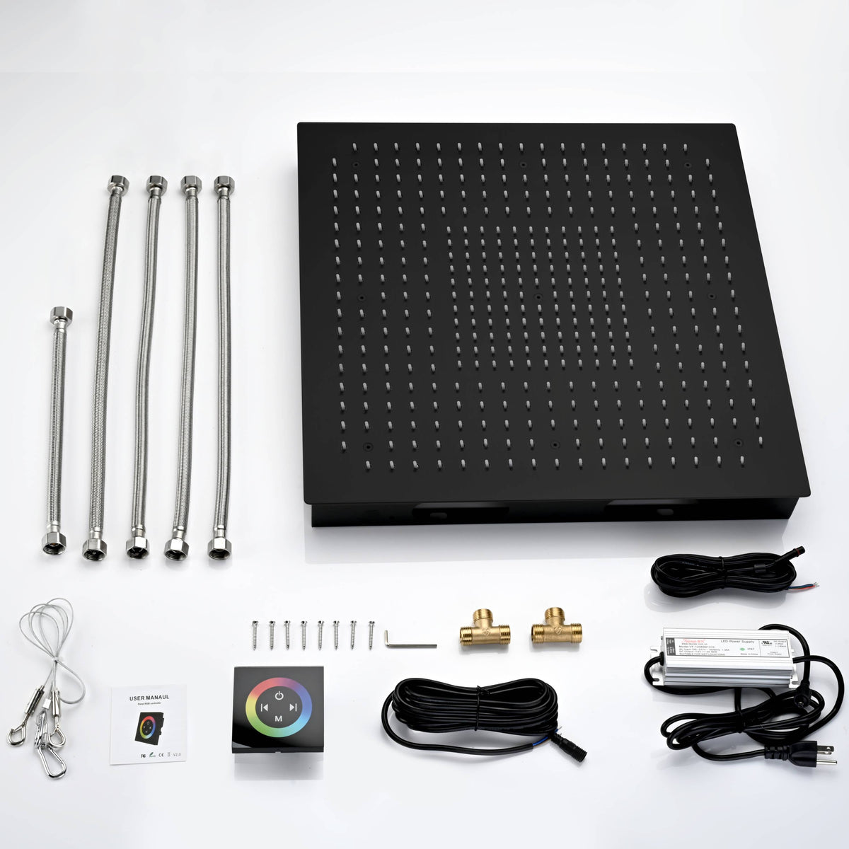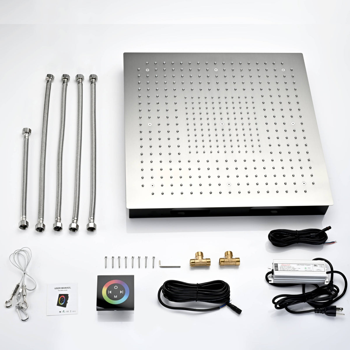 The flush 20'' x 20'' rainfall head come with 64 led light that work by 6~ 12 V electronic power and you may turn on or off the led light By touch panel during take a shower.
