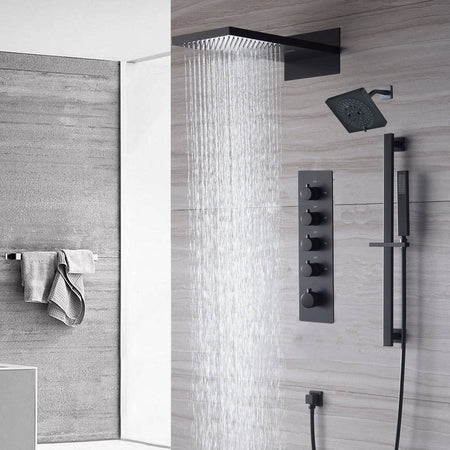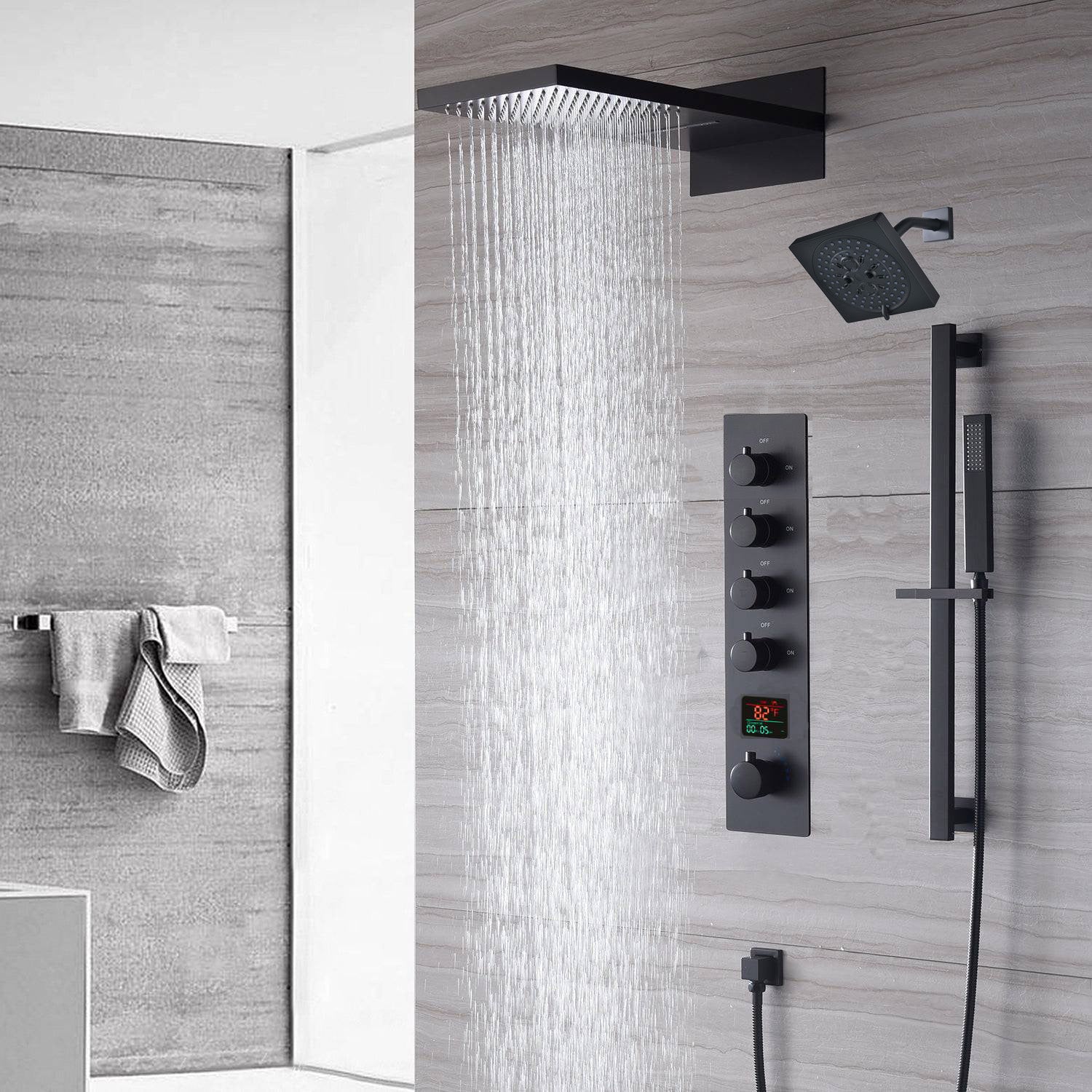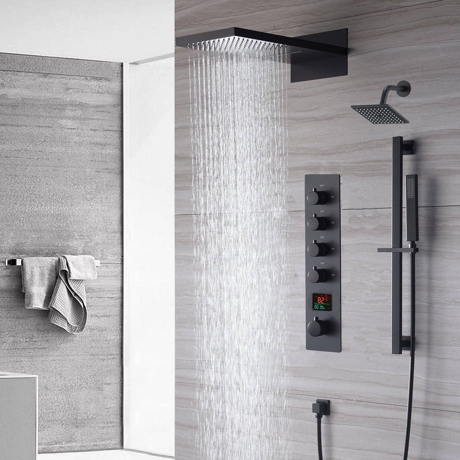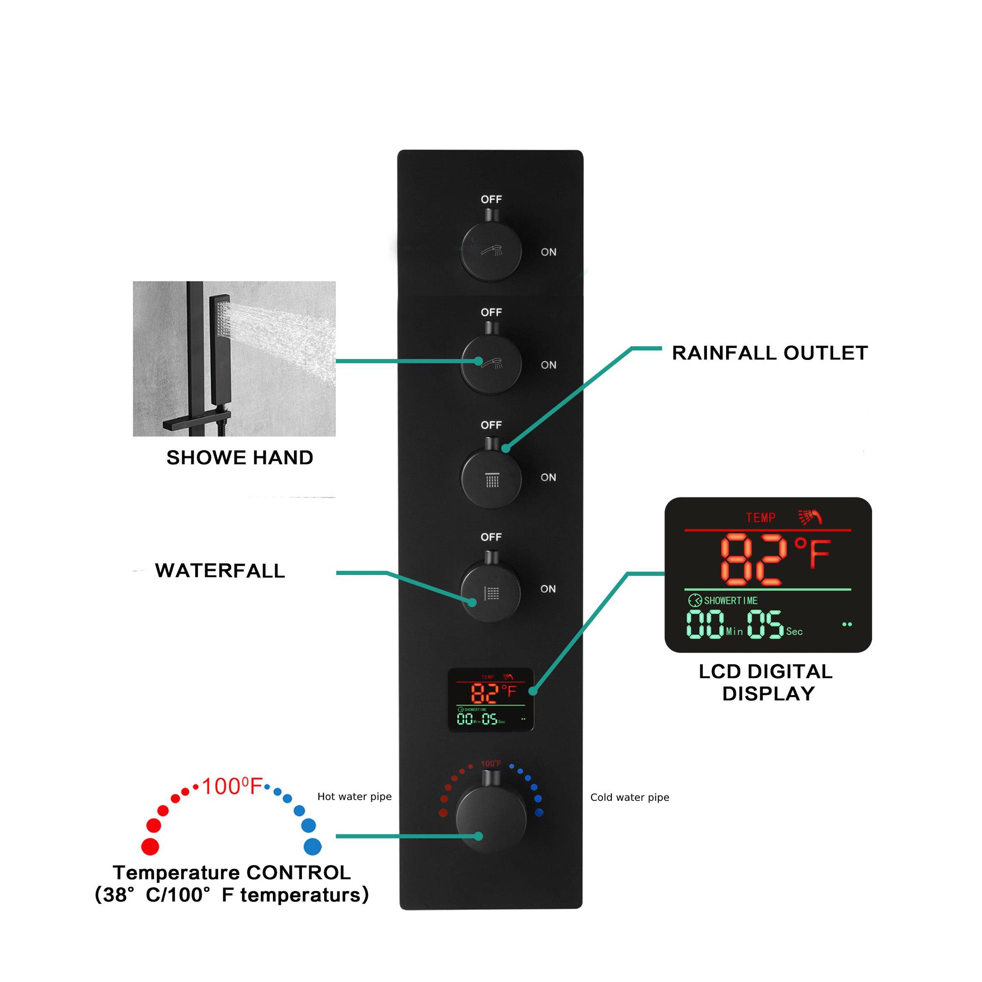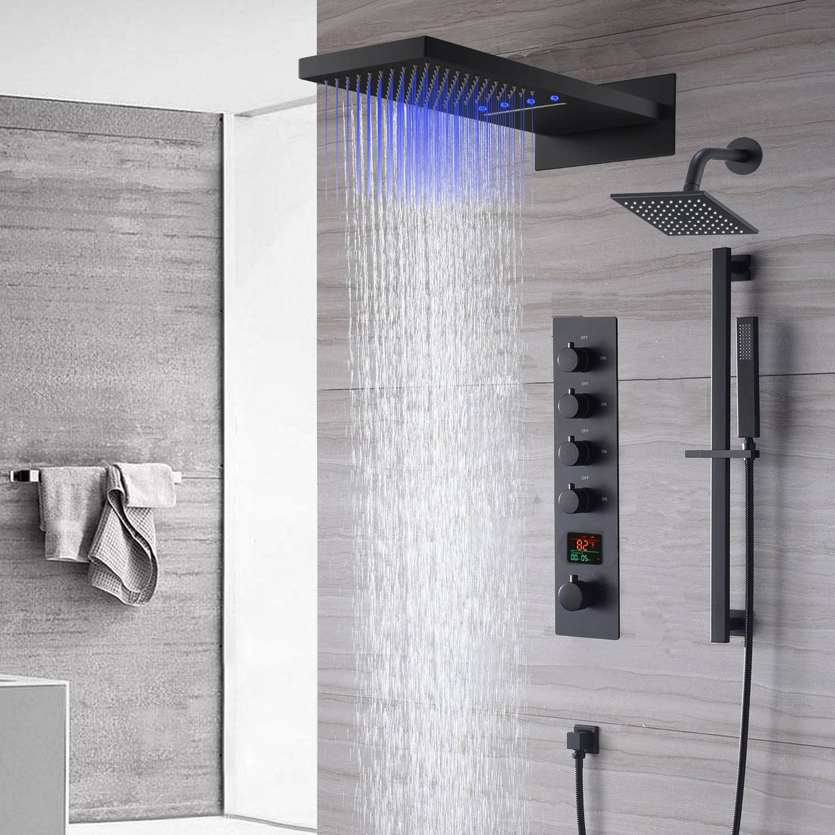 4-Way Matte Black Thermostatic Shower System with LED Rainfall and Waterfall Shower Head: