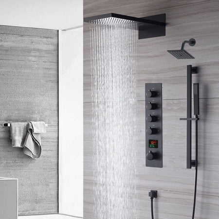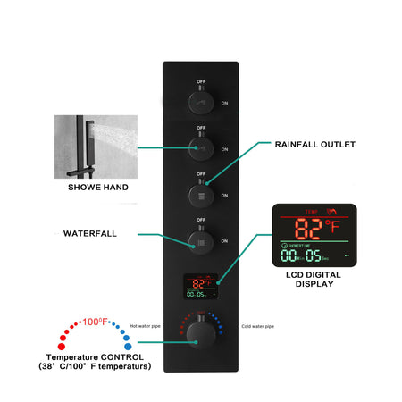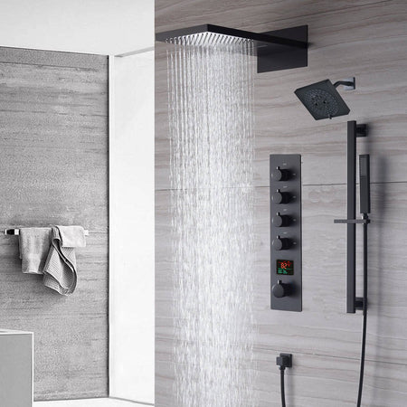 This 4-way matte black thermostatic shower system offers an all-in-one solution for a luxurious and safe shower experience. With its LED rainfall and waterfall shower head,6 inch regular head, adjustable water flow and temperature, and chic matte black finish, it brings contemporary elegance and high functionality to your bathroom.