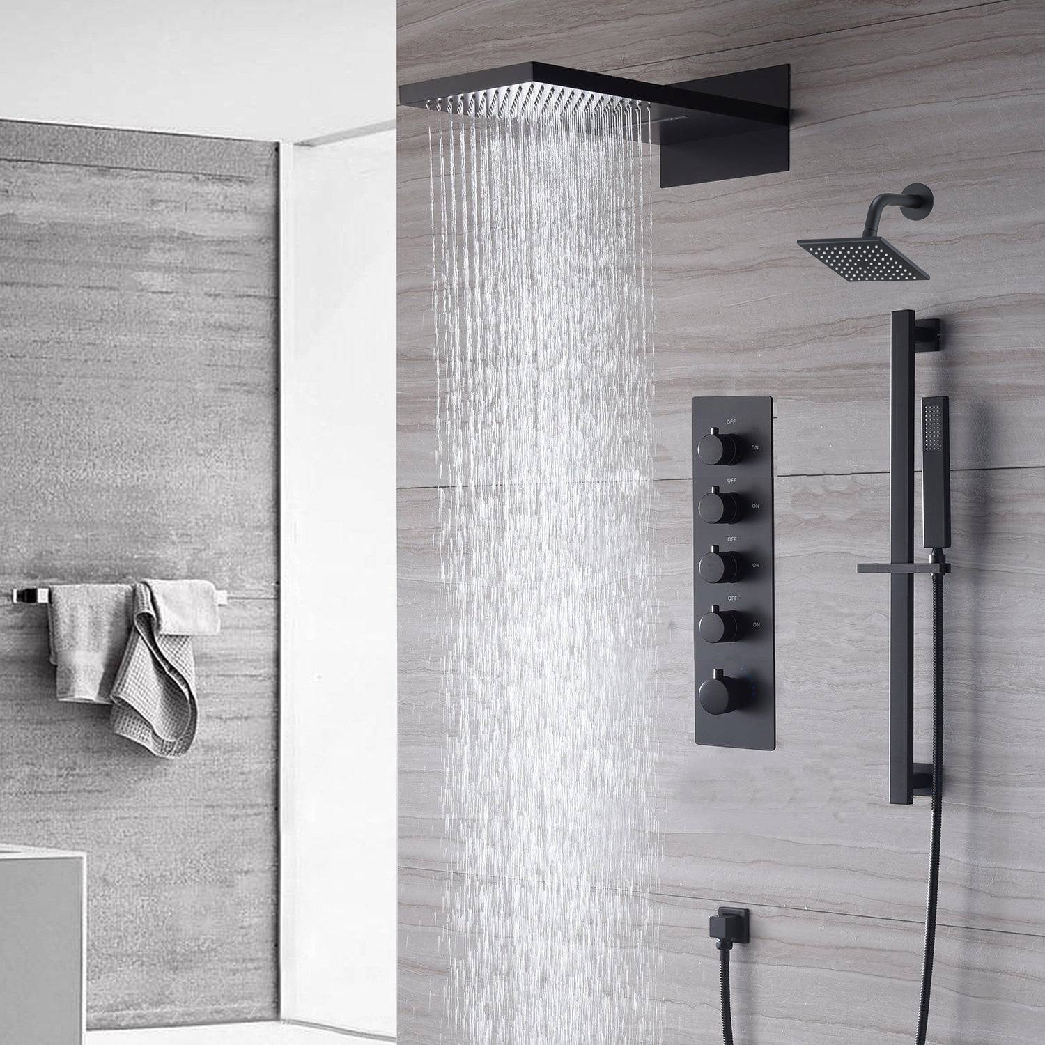 waterfall rainfall 22'' matte black 4 Way Thermostatic Shower Faucet system with sliding bar and regular head