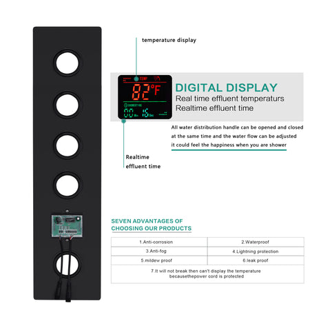 Digital Display Thermostatic Valve: Each function can run separately or simultaneously. The digital display is powered by water flow and requires no batteries. Water flow, pressure, and temperature can be adjusted via knobs.