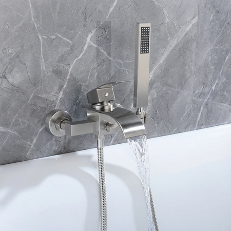 Immerse Yourself in Luxury with our Brushed Nickel Waterfall Wall-Mount Bath Tub Filler Faucet: Crafted from durable solid brass and finished in brushed nickel, this faucet offers both durability and an elegant look. All fittings needed for installation are included: faucet, hand shower, handshower holder, mounting hardware, and shower hose.